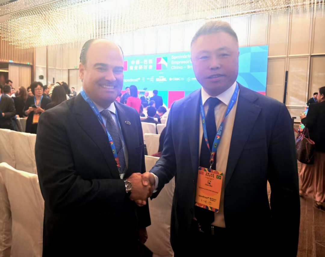 中国肉类协会会长陈伟与马夫瑞集团及巴西食品公司副总裁布鲁诺·菲尔拉,在2025年5月12日召开的中国-巴西商业研讨会期间交流合作推动绿色贸易。