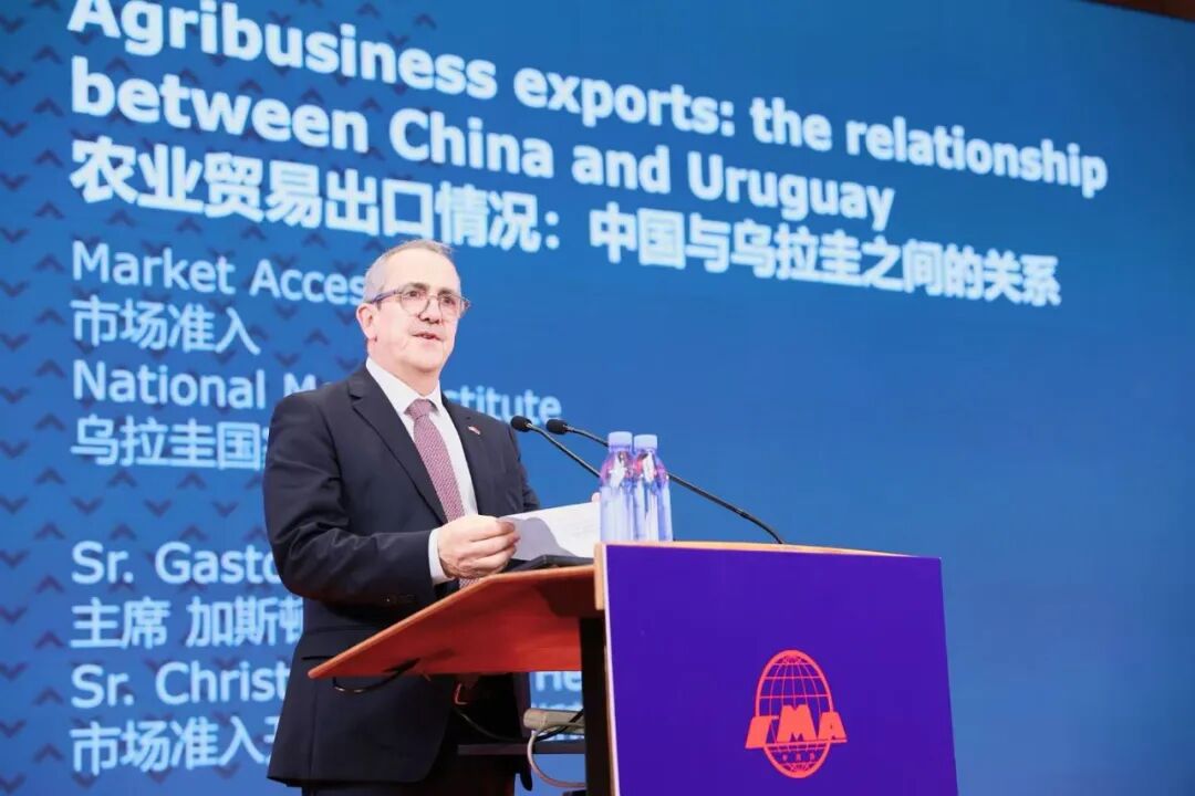 乌拉圭国家肉类协会主席加斯顿·斯卡约拉(Gastón Scayola)、市场准入开发主管克里斯蒂安·肖(Christian Shaw)介绍了乌拉圭肉类产业链的特点与优势、农业贸易出口情况以及与中国之间的贸易关系。克里斯蒂安•肖 (Christian Shaw)强调,乌拉圭十分看重与中国的合作关系,数据显示,对中国的肉类出口占比远超其他国家。未来,会积极参与中国肉类产业活动,相互合作、相互交流,促进双方经济发展。